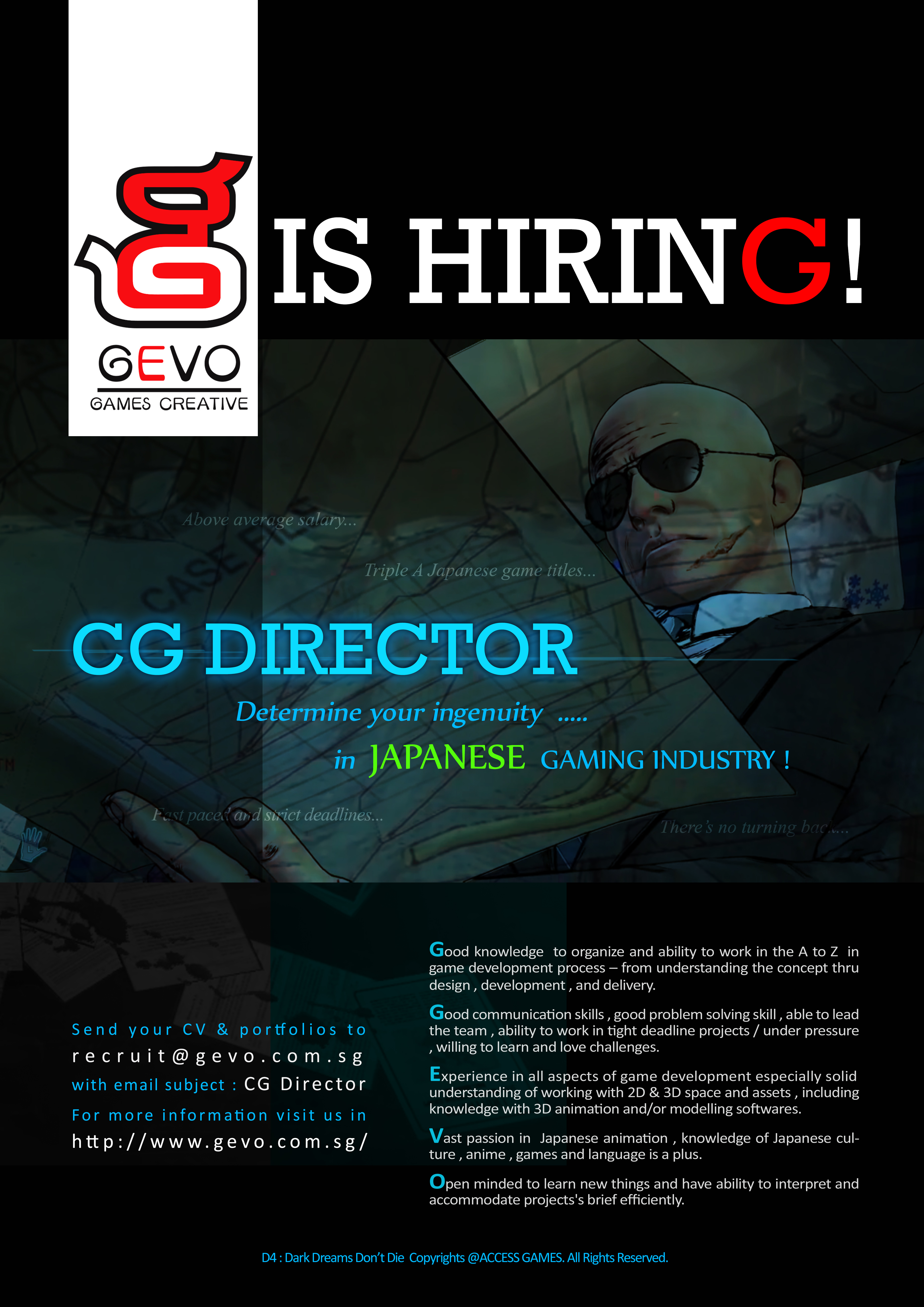 Send your CV and Portfolio to: recruit@gevo.com.sg